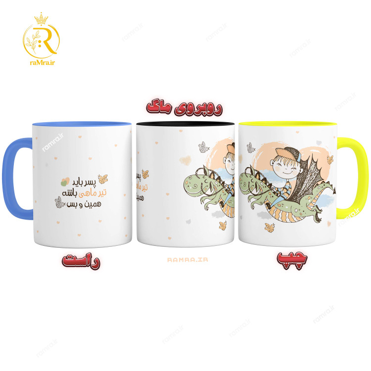 ماگ پسر تیر ماهی با دسته و داخل رنگی که میتوانید درهنگام خرید رنگ دسته را انتخابش کنید.