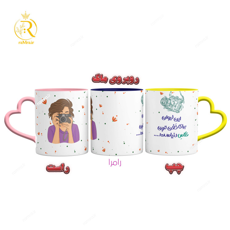 ماگ خانم عکاس9105 با دسته و داخل رنگی که میتوانید درهنگام خرید رنگ دسته را انتخابش کنید