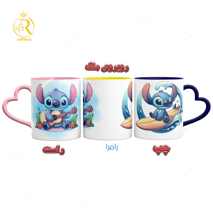 ماگ استیج Stitch 9106 با دسته قلبی و داخل رنگی که میتوانید درهنگام خرید رنگ دسته را انتخابش کنید.