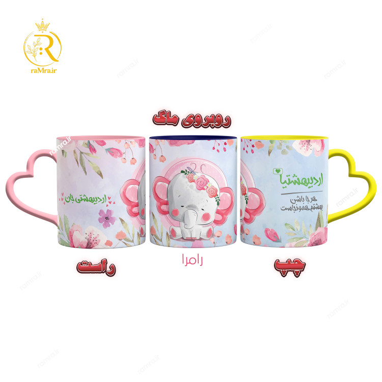 ماگ اردیبهشتی ها 9174 و طرح فیل بامزه با دسته و داخل رنگی که میتوانیدهنگام خرید در فروشگاه رامرا رنگ دسته را انتخابش کنید.