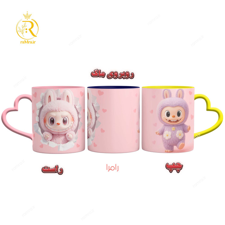 ماگ لبوبو LABUBU کد 9203 با دسته قلبی و داخل رنگی که میتوانید هنگام خرید در فروشگاه رامرا رنگ دسته و داخل ماگ را انتخابش کنید.