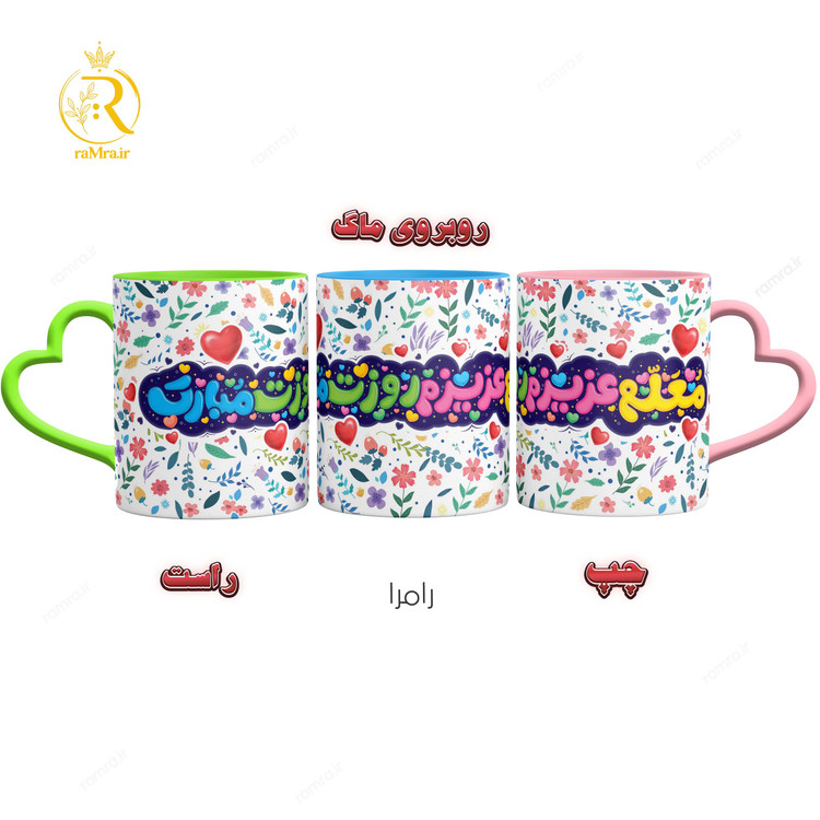 ماگ تبریک روز معلم دسته قلبی کد 9262 با دسته ی قلبی و داخل رنگی که میتوانید هنگام خرید در فروشگاه رامرا رنگ دسته و داخل ماگ را انتخابش کنید.