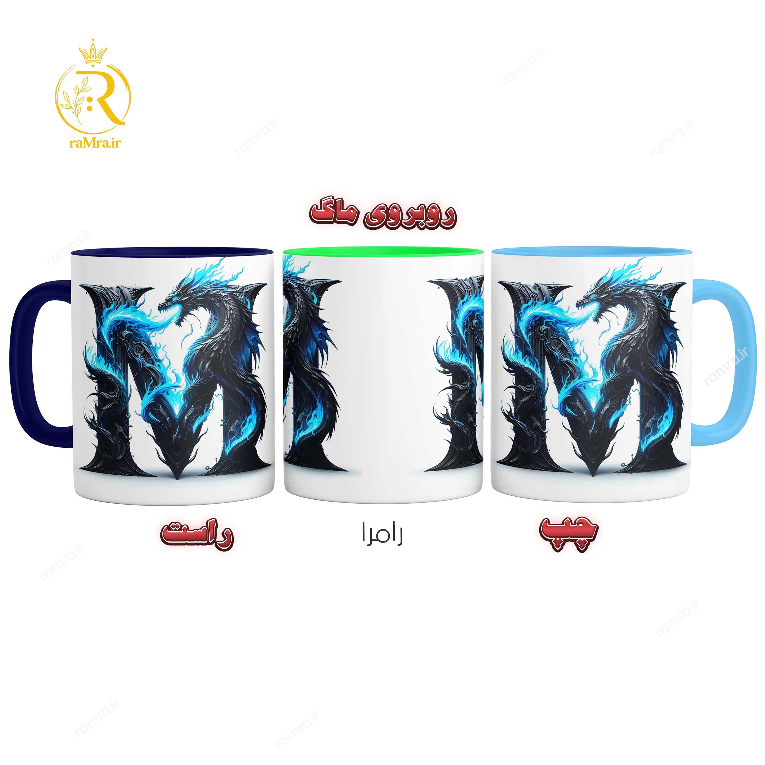 ماگ طرح حرف M کد 9310 با دسته و داخل رنگی که میتوانید هنگام خرید در فروشگاه رامرا رنگ دسته و داخل ماگ را انتخابش کنید.