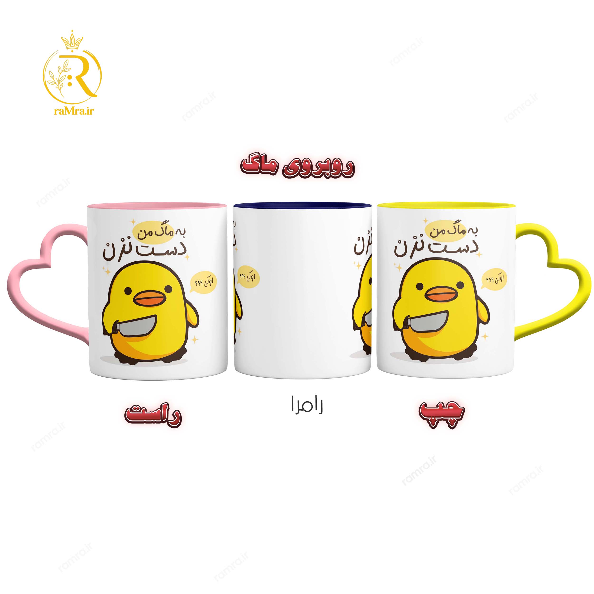 1: اگر میخواهید همین طرح روی ماگ حرارتی (جادویی) باشد، در گزینه های انتخاب رنگ گزینه ی حرارتی (جادویی) را انتخاب کنید) و اگر میخواهید مانند تصویر ماگ دسته رنگی و غیر جادویی باشد میتوانید از بین گزینه ها رنگ مورد علاقتون را انتخاب کنید