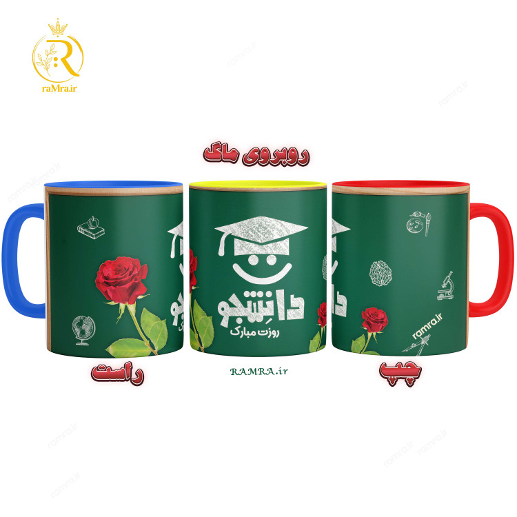 ماگ تبریک روز دانشجو با دسته و داخل رنگی که میتوانید درهنگام خرید انتخابش کنید.